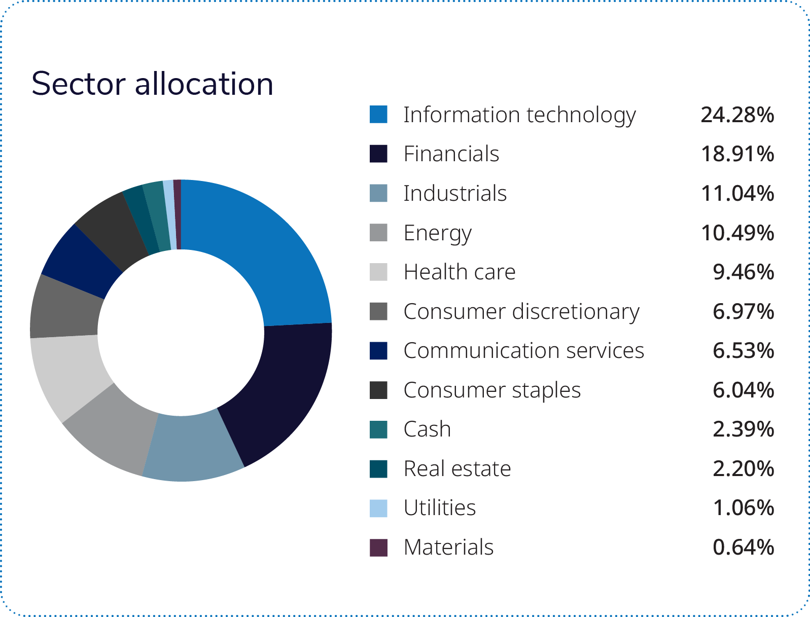 The mandate is overweight in the energy and financials sectors, and underweight in the communication services, consumer discretionary, materials and information technology sectors. Regionally, the strategy has approximately 25% weight in Europe, 74% weight in North America and 1% weight in Asia.