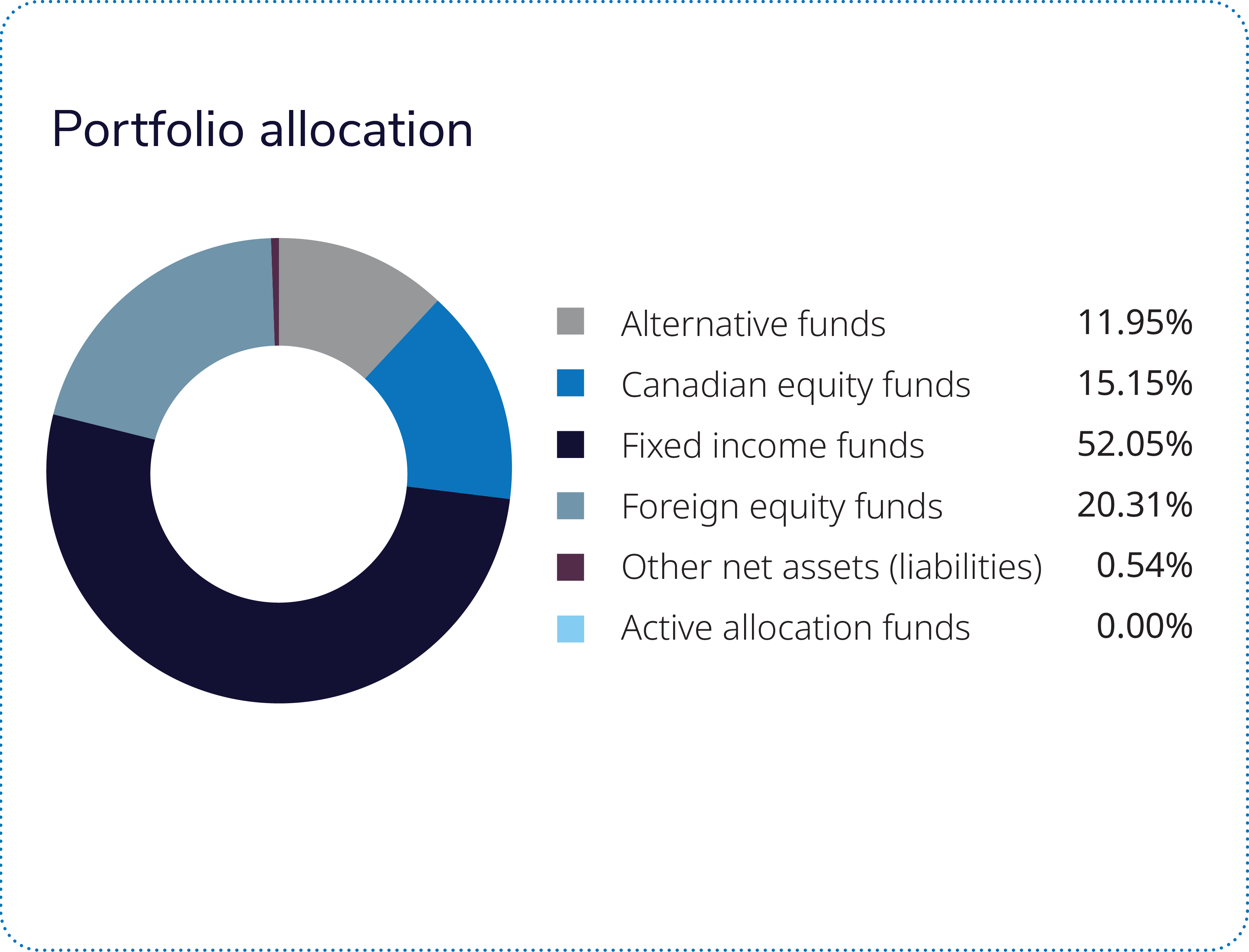 The IG Mackenzie Real Property Fund was the sole detractor, and the Mackenzie Enhanced Fixed Income Risk Premia Fund was the smallest contributor to portfolio returns. The IG Mackenzie Real Property Fund posted a negative return, due to the markdown of values of two office properties and the reclassification of a retail property from income-producing to development land. However, the fund’s operating metrics remained strong, with rental revenue, net operating income and vacancy rates all trending positively over the period. The Mackenzie Enhanced Fixed Income Risk Premia Fund is a levered alternative fixed income fund. The investment team uses the fund to efficiently manage total portfolio fixed income exposure. Falling bond yields led to rising bond prices and were beneficial to fixed income returns.