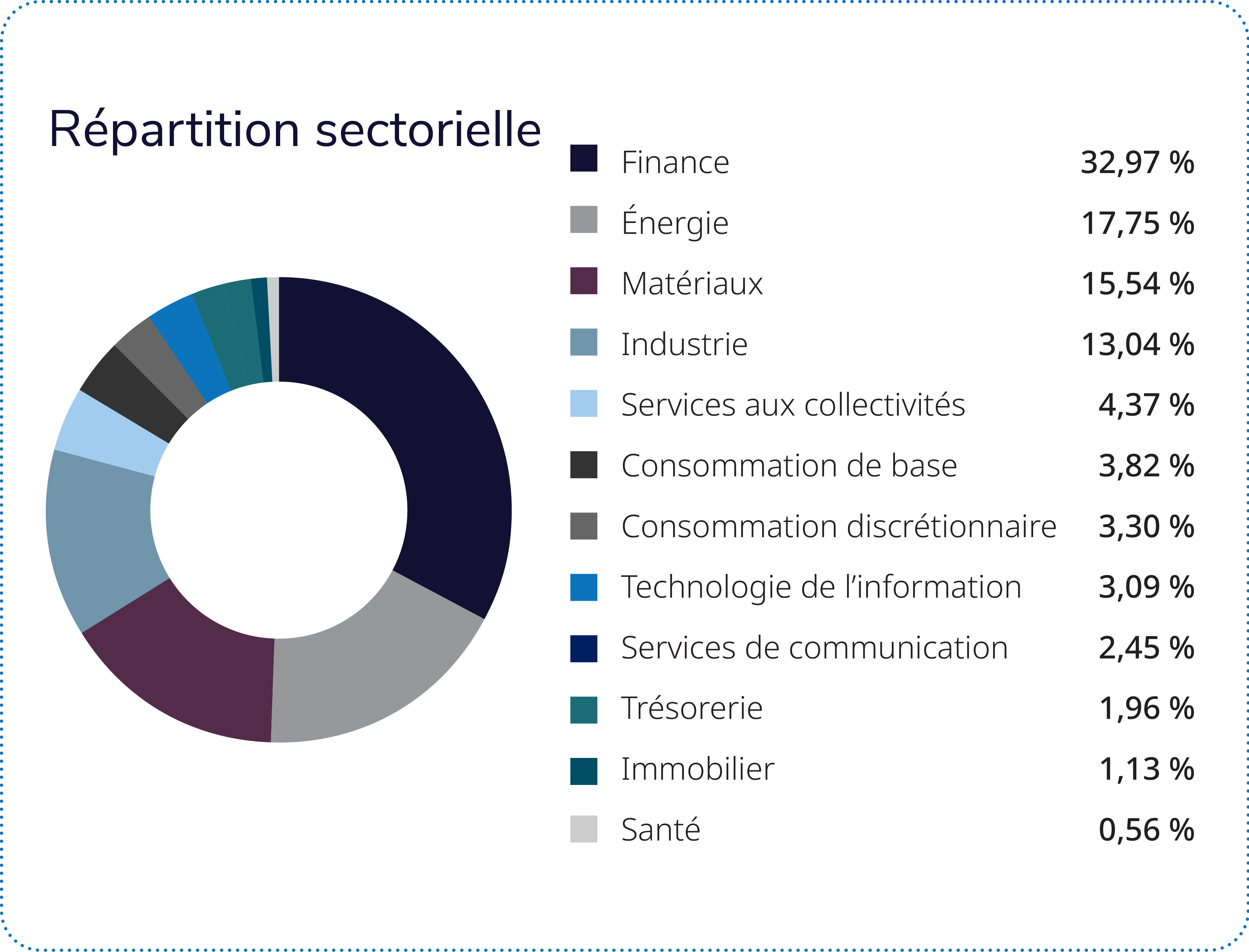 ① Le mandat a inscrit un rendement positif. Une sélection de titres défavorable dans le secteur des matériaux et la sous-pondération du secteur de la technologie de l’information ont nui au rendement du mandat par rapport à l’indice de référence.