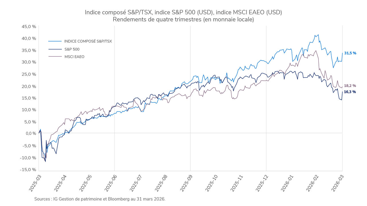 Le premier trimestre de 2026 a commencé avec un élan économique favorable, une amélioration du secteur manufacturier, une stabilisation du marché du logement aux États-Unis et une inflation contenue. Toutefois, la situation a basculé en raison du conflit au Moyen-Orient impliquant l’Iran, parallèlement aux perturbations commerciales entourant le détroit d’Ormuz, qui a fait grimper les prix des produits de base énergétiques. Le choc énergétique a occasionné de la volatilité sur les marchés boursiers mondiaux, mais les conditions sous-jacentes se sont avérées plus résilientes que ce qui était sous-entendu dans les manchettes, renforçant la valeur de la diversification.