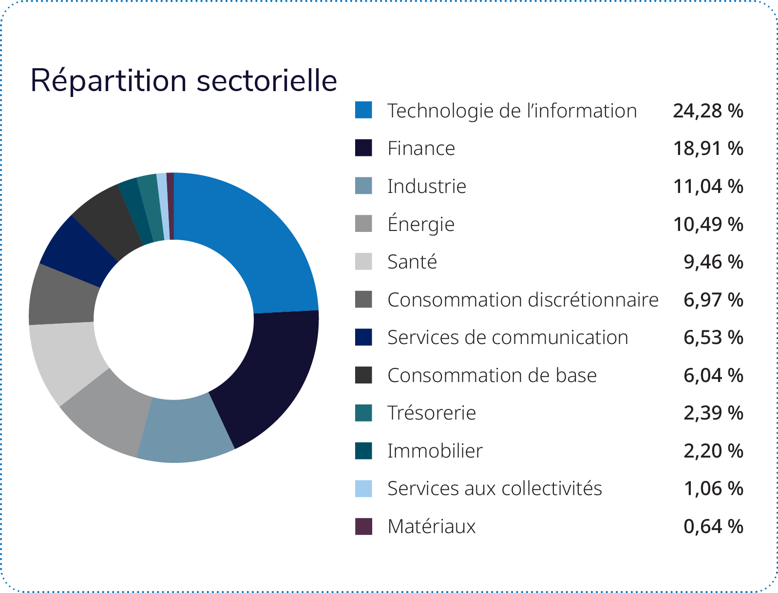 Le mandat est surpondéré dans les secteurs de l’énergie et de la finance, et sous-pondéré dans ceux des services de communication, de la consommation discrétionnaire, des matériaux et de la technologie de l’information. Au niveau régional, la stratégie affichait une pondération d’environ 25 % en Europe, 74 % en Amérique du Nord et 1 % en Asie.
