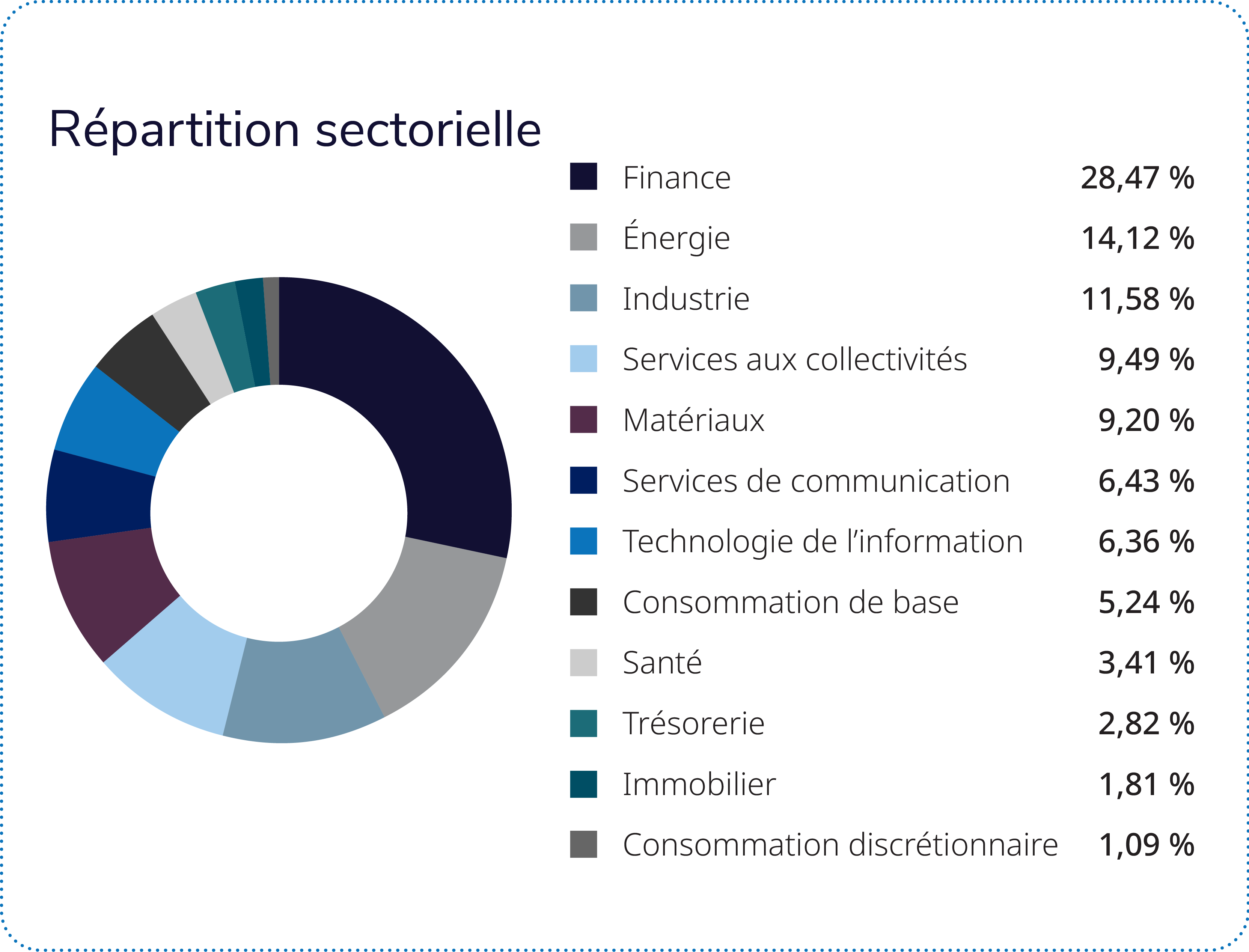 ① Le mandat a produit d’excellents rendements absolus au cours du dernier trimestre. Il a été soutenu par la performance de ses placements dans les secteurs de la finance, de l’énergie, des matériaux et de la technologie de l’information.