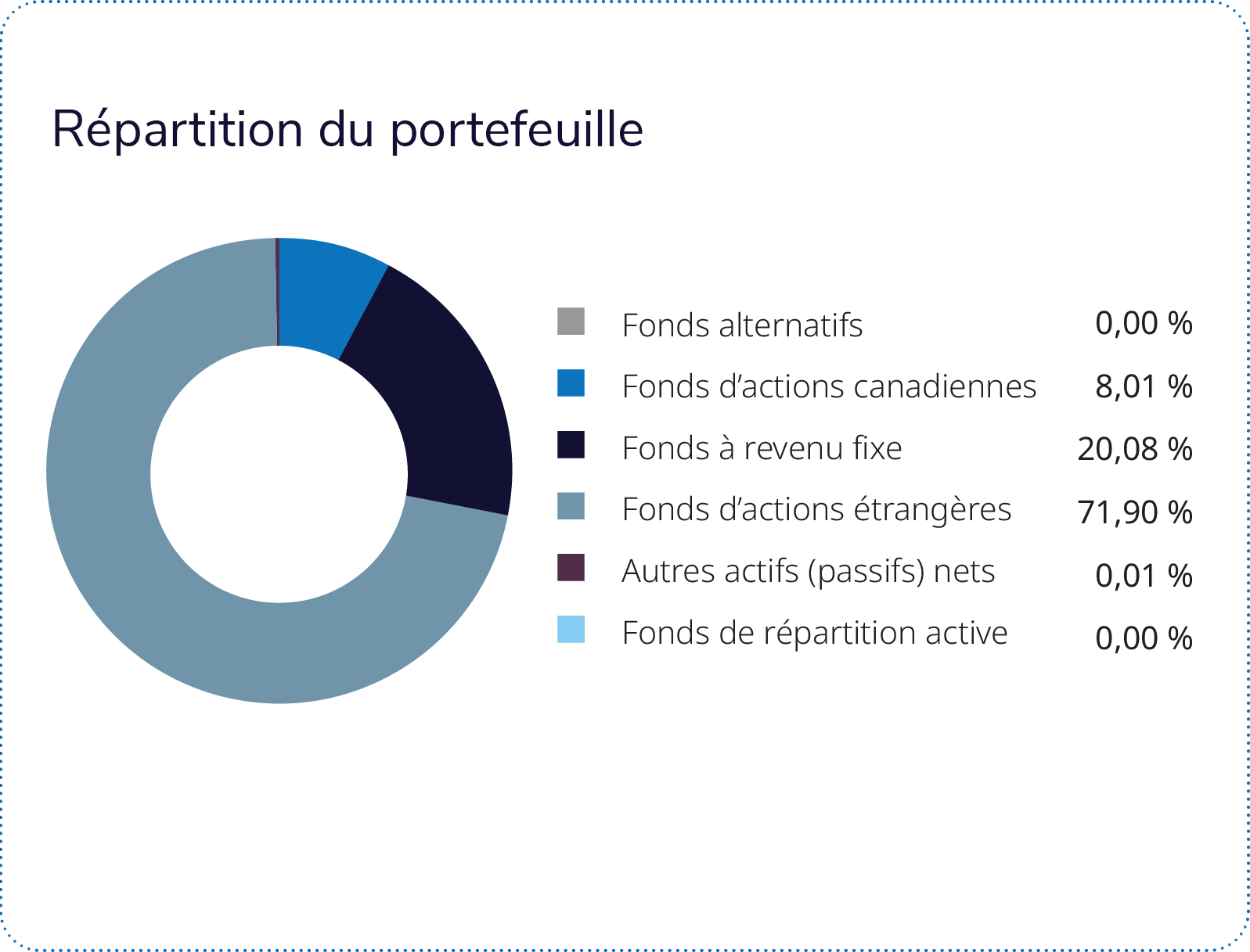 Le Fonds d’actions mondiales Mackenzie Betterworld, le Fonds Leaders de la durabilité Putnam – IG Mandat privé et le FNB iShares ESG Advanced MSCI USA ont nui le plus au rendement du portefeuille. Le Fonds d’actions mondiales Mackenzie Betterworld a produit un rendement inférieur à celui de son indice de référence, la sélection des titres dans les secteurs de la santé, de la technologie de l’information et des matériaux ayant nui le plus au rendement. Le Fonds Leaders de la durabilité Putnam – IG Mandat privé a produit un rendement inférieur à celui de son indice de référence, principalement en raison de la sélection des titres dans les secteurs de la finance et de la technologie de l’information, ainsi que de la sous-pondération du secteur de l’énergie.