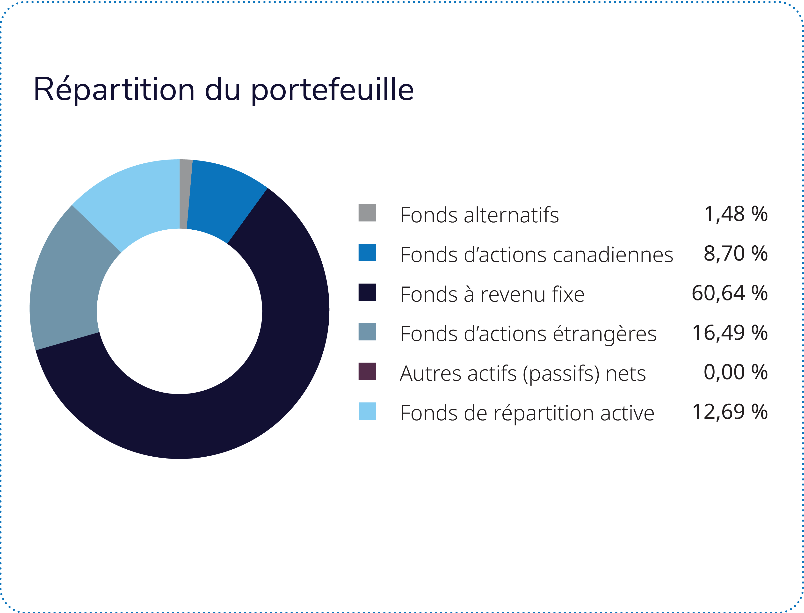 Toutes les composantes en titres à revenu fixe du portefeuille ont affiché des rendements inférieurs à ceux des composantes en actions. Par conséquent, les titres à revenu fixe, qui représentent plus de la moitié du portefeuille, n’ont généré qu’un quart du rendement total. Le Fonds de biens immobiliers IG Mackenzie est la seule composante du portefeuille à avoir perdu du terrain au cours de la période.
