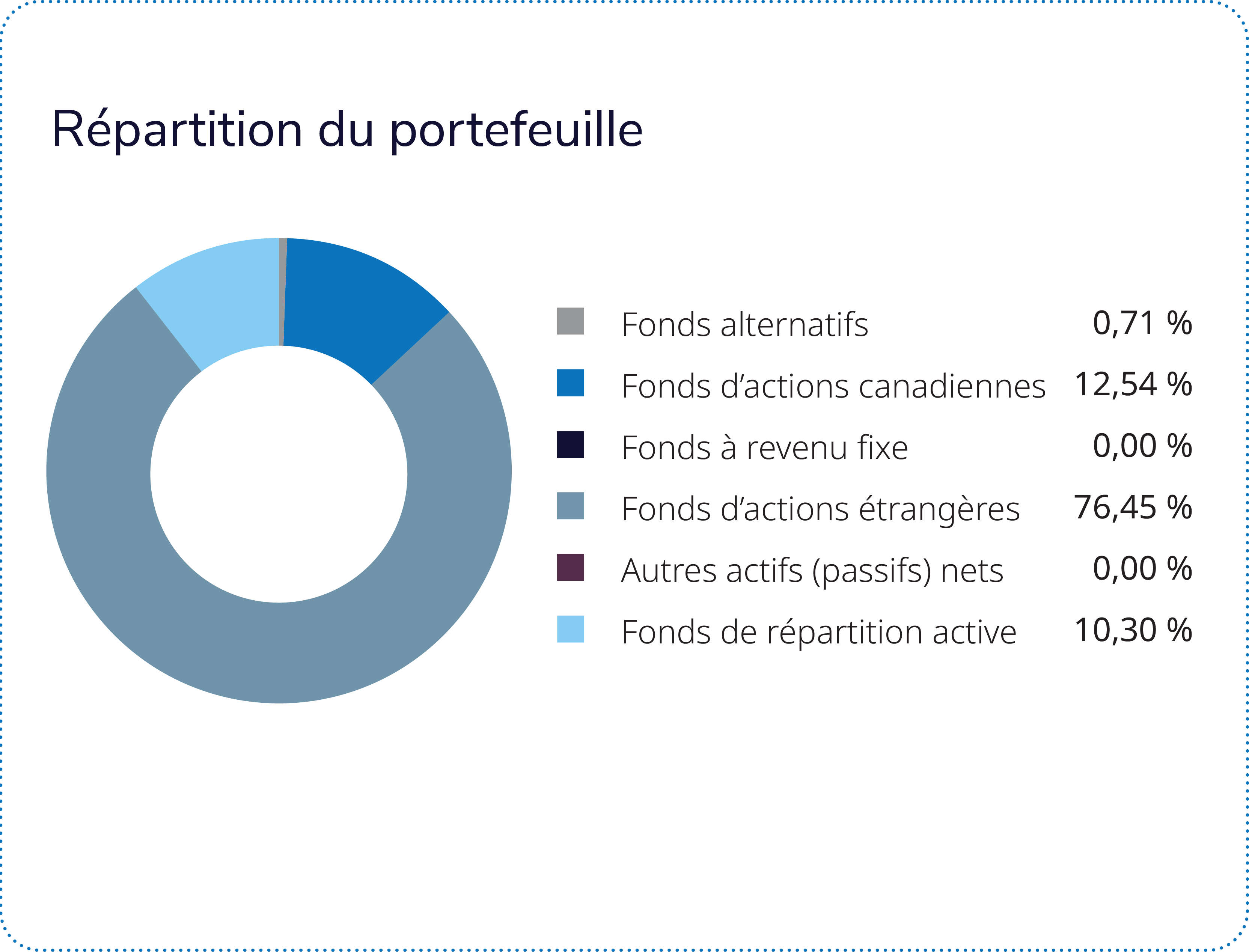 Le Fonds en gestion commune de marchés émergents JPMorgan – IG est la composante du portefeuille qui a inscrit le meilleur rendement. Toutefois, en raison de sa pondération relativement faible au sein du portefeuille, il n’a eu que peu d’incidence sur les résultats dans leur ensemble. Le Fonds en gestion commune d’actions canadiennes Mackenzie – IG, qui a enregistré un rendement de plus de 10 %, est arrivé en deuxième position. Toutefois, son rendement a été légèrement inférieur à celui de l’indice composé S&P/TSX, surtout en raison de la sous-pondération du secteur des matériaux, qui s’est le mieux comporté. Les composantes en actions américaines à grande capitalisation, le Fonds en gestion commune d’actions américaines Mackenzie – IG et le Fonds en gestion commune d’actions américaines T. Rowe Price – IG, ont été les fonds qui ont le mieux servi le rendement, comptant pour près de la moitié du rendement total du portefeuille. Ils ont toutefois également affiché un rendement inférieur à celui de l’indice S&P 500, leur principal indice de référence.Le Fonds en gestion commune d’actions canadiennes Fidelity – IG, le Fonds d’actions panasiatiques IG Mackenzie et le Fonds en gestion commune de répartition active BlackRock – IG IV se sont aussi hissés parmi les plus performants.