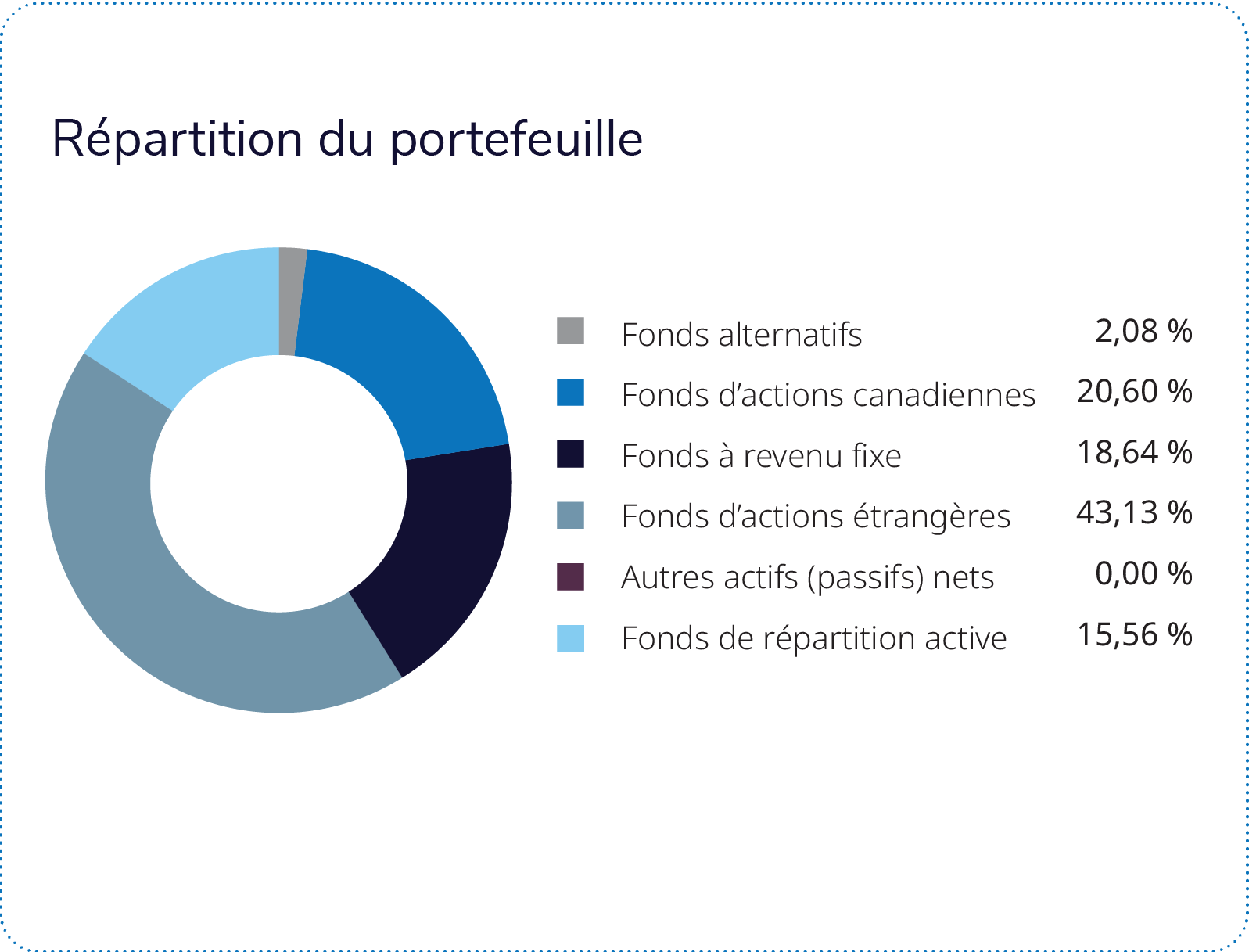 Les actions ont été le principal facteur de rendement, l’exposition aux actions canadiennes et à certaines actions mondiales ayant le plus contribué au rendement. Le Fonds en gestion commune d’actions canadiennes Mackenzie – IG a été le plus avantageux, ce qui témoigne d’excellents rendements absolus et d’une pondération importante dans le portefeuille. Le Fonds en gestion commune d’actions canadiennes Fidelity – IG, les stratégies d’actions européennes IG Mackenzie, le Fonds en gestion commune de marchés émergents JPMorgan – IG et les répartitions diversifiées au sein du Fonds en gestion commune de répartition active BlackRock – IG II ont également contribué au rendement.
