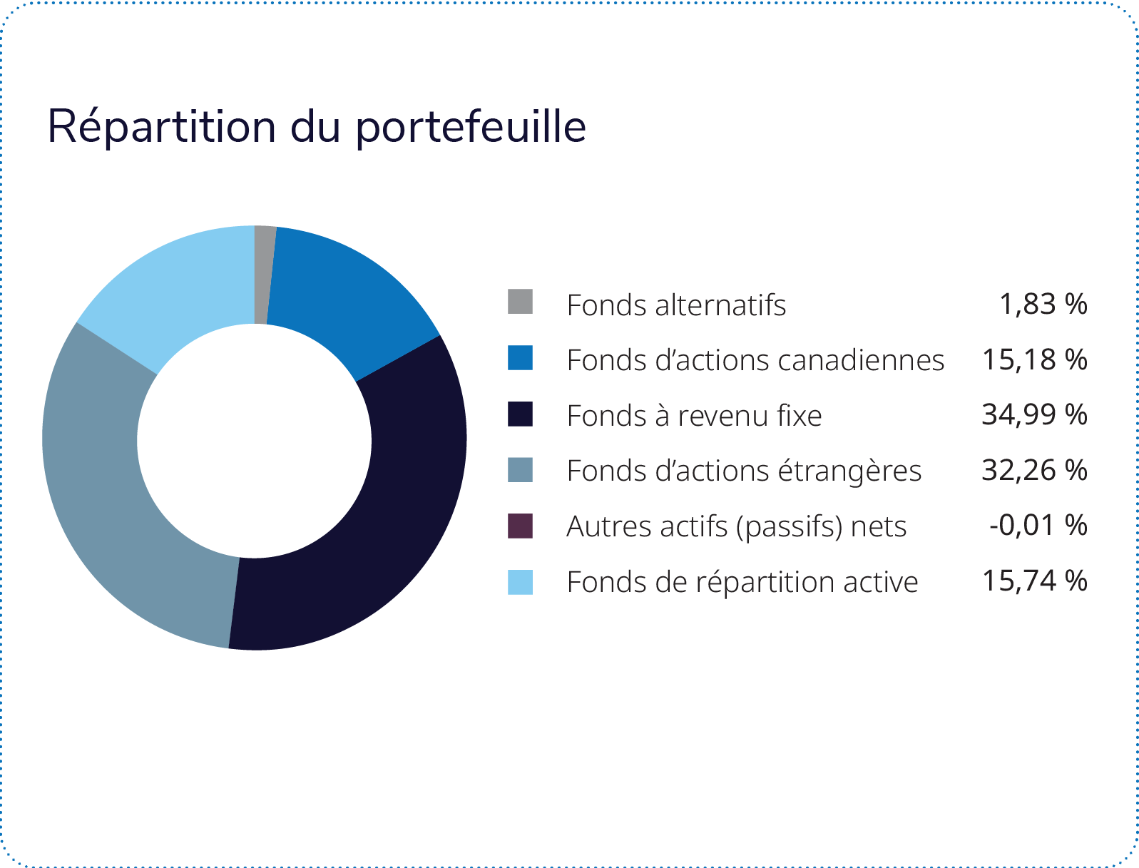 Les actions ont été le principal facteur de rendement, l’exposition aux actions canadiennes et à certaines actions mondiales ayant le plus contribué aux résultats. Le Fonds en gestion commune d’actions canadiennes Mackenzie – IG a été le plus avantageux, ce qui témoigne d’excellents rendements absolus et d’une pondération importante dans le portefeuille. Le Fonds en gestion commune d’actions canadiennes Fidelity – IG, les stratégies d’actions européennes IG Mackenzie, le Fonds en gestion commune de marchés émergents JPMorgan – IG et les répartitions diversifiées au sein du Fonds en gestion commune de répartition active BlackRock – IG II ont également contribué au rendement.
