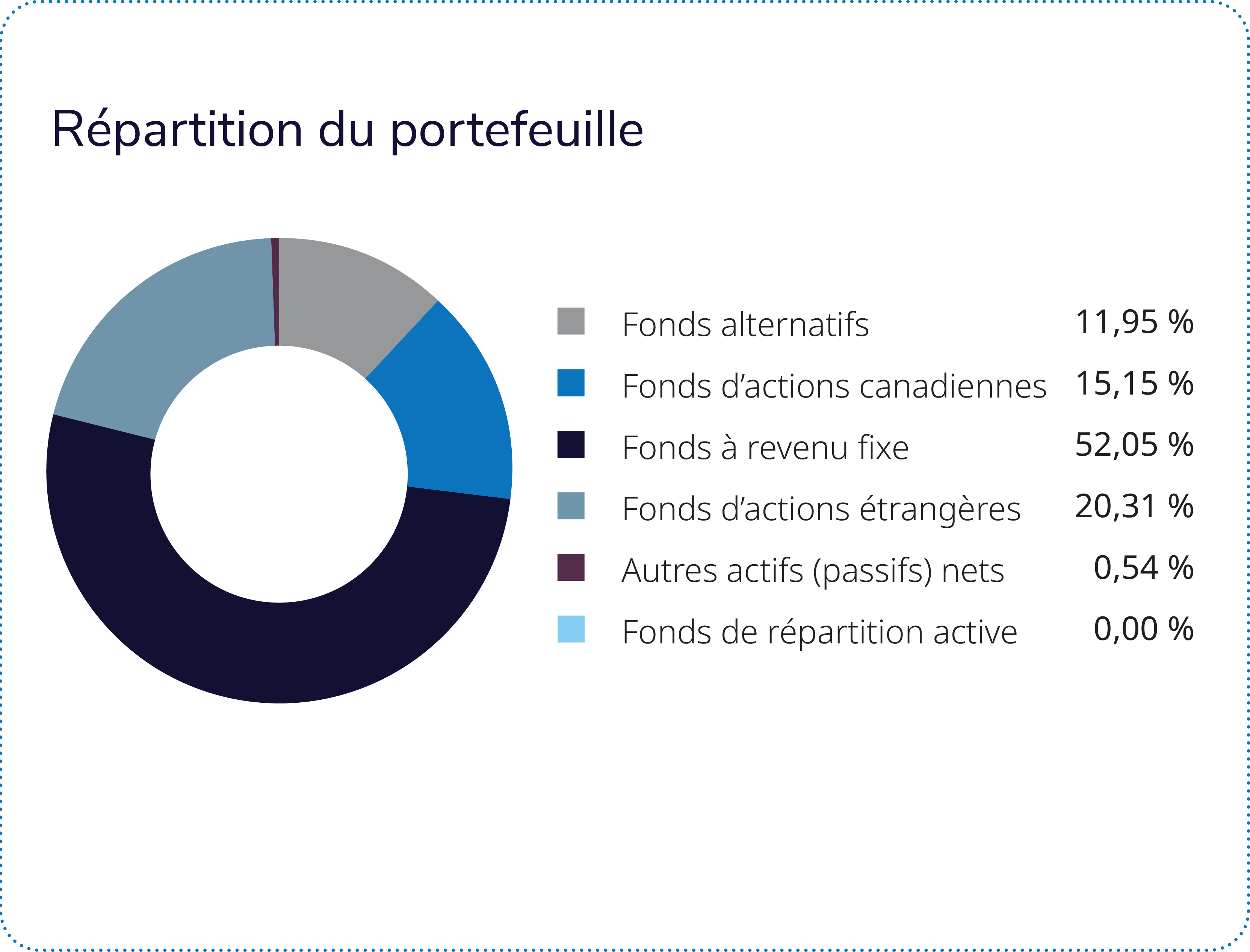Le Fonds de biens immobiliers IG Mackenzie a été le seul frein au rendement, et le Fonds de primes de risque améliorées sur titres à revenu fixe Mackenzie est celui qui a le moins favorisé le rendement du portefeuille. Le Fonds de biens immobiliers IG Mackenzie a inscrit un rendement négatif, en raison de la baisse de valeur de deux immeubles de bureaux et de la conversion d’un centre commercial générateur de revenus en terrain à développer. Les paramètres d’exploitation du Fonds sont demeurés robustes, notamment en raison de la progression des revenus de location, du revenu net d’exploitation et des taux d’inoccupation durant la période. Le Fonds de primes de risque améliorées sur titres à revenu fixe Mackenzie est un fonds alternatif à revenu fixe ayant recours à l’effet de levier. L’équipe de placement utilise le fonds pour gérer de façon efficace l’exposition globale du portefeuille aux titres à revenu fixe. La baisse des taux a entraîné une hausse des prix des obligations et favorisé les rendements des titres à revenu fixe.
