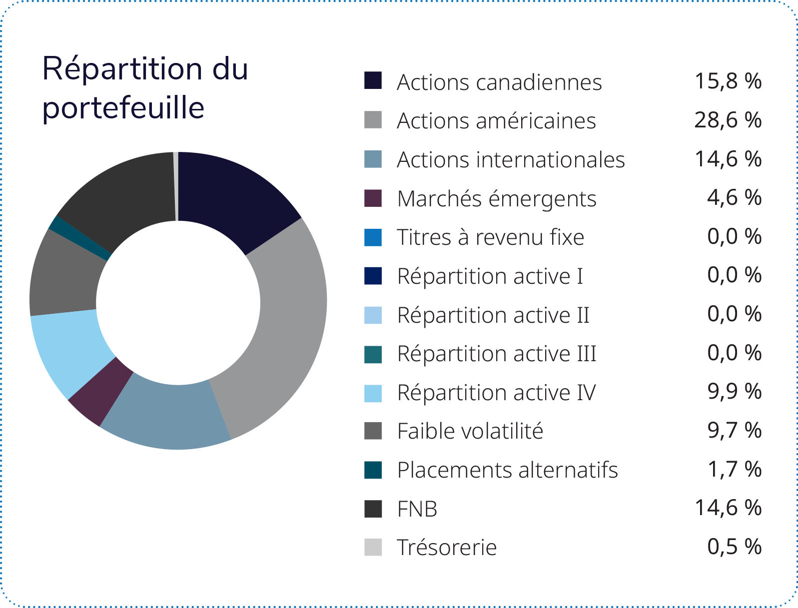 Le Fonds privé à faible volatilité Profil (0,04 %) a été la composante la moins performante du portefeuille. Il a été à la traîne de la plupart des grands indices du marché des grandes capitalisations, en raison de la sous-performance générale des actions à faible volatilité. Les indices d’actions à faible volatilité ont accusé du retard sur les indices comparables à volatilité normale dans toutes les régions. Le Fonds privé de placements alternatifs Profil (0,9 %) a également tiré de l’arrière par rapport aux principaux indices d’actions. Le fonds à faible volatilité et le fonds alternatif sont conçus pour offrir de la stabilité pendant les épisodes de volatilité des marchés et n’ont pas pour but de générer des rendements supérieurs durant les périodes de forte hausse des marchés boursiers.