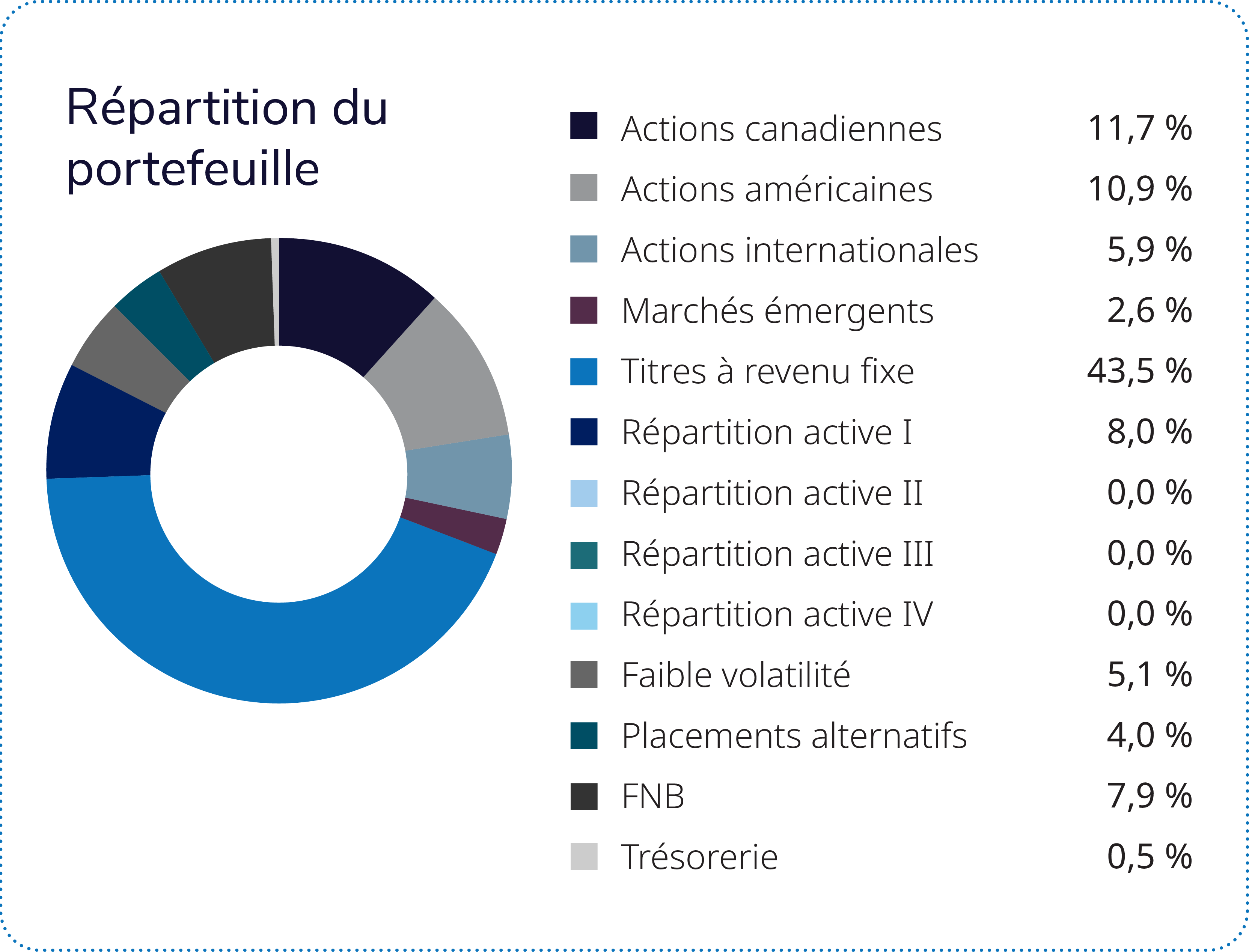 Le Fonds privé de titres à revenu fixe Profil (1,6 %) est le Fonds Profil le plus fortement représenté dans le portefeuille et a donc, malgré sa modeste avancée, contribué largement au rendement total du portefeuille. Les titres à revenu fixe mondiaux ont inscrit un rendement légèrement positif durant le trimestre, car les taux obligataires ont glissé en Amérique du Nord, mais ont quelque peu grimpé en Europe et au Japon. Les craintes budgétaires (concernant la hausse des dépenses publiques et l’inflation), dans certains cas liées à l’incertitude politique, ont engendré une pression à la hausse sur les taux obligataires au Royaume-Uni, en France et au Japon, en particulier. Les obligations nord-américaines ont donc surpassé les obligations internationales. Au Canada et aux États-Unis, les obligations de sociétés ont légèrement dépassé les obligations gouvernementales, et les obligations à rendement élevé ont mieux fait que les obligations de sociétés de première qualité, car les écarts de crédit se sont resserrés. Le segment des titres à revenu fixe multisectoriels, géré par Manuvie et ajouté au Fonds à la fin de 2024, a été le plus performant. Le Fonds de biens immobiliers IG Mackenzie est la seule composante du Fonds qui a perdu du terrain et a nui au rendement.