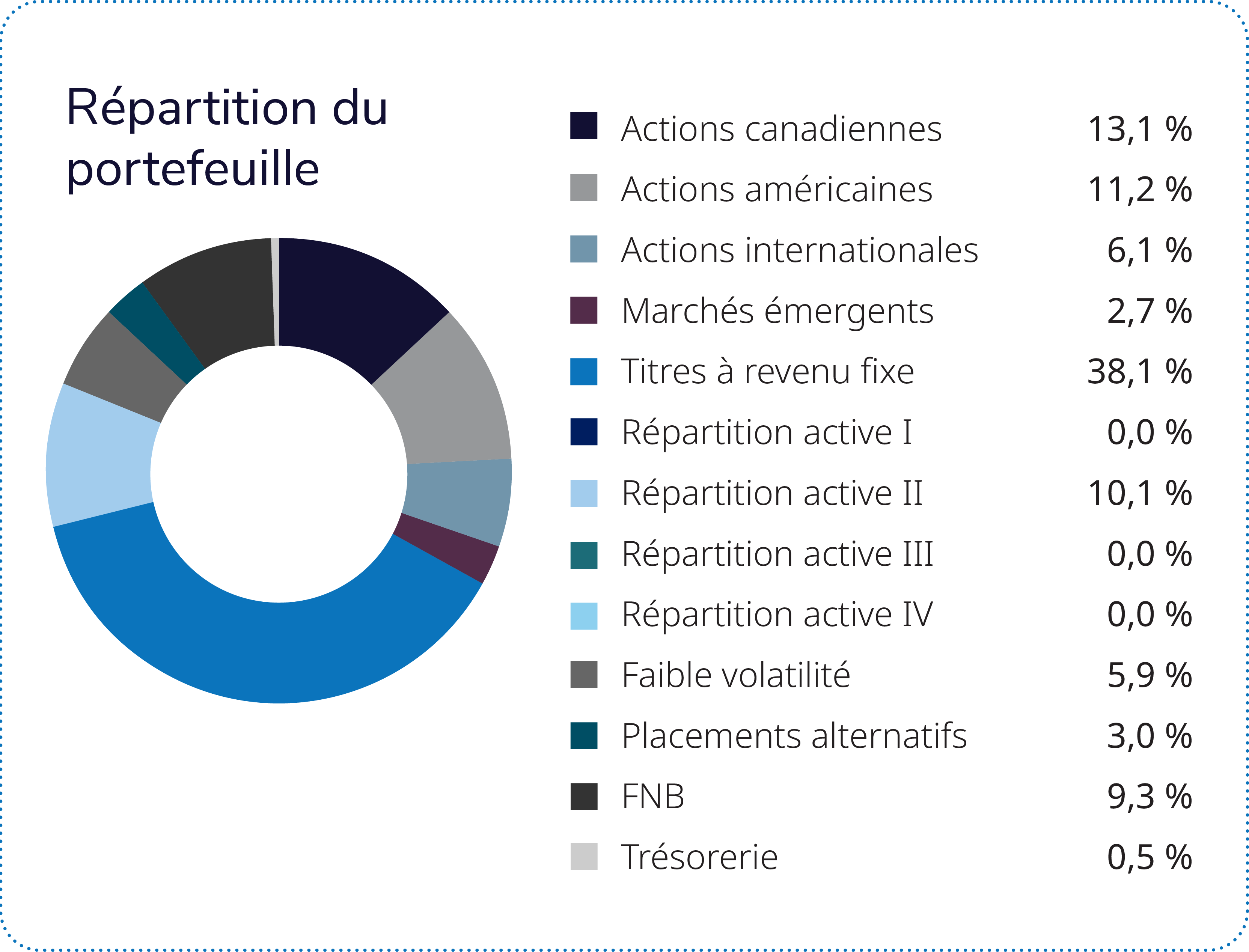Le Fonds privé de titres à revenu fixe Profil (1,6 %) est le Fonds Profil le plus fortement représenté dans le portefeuille et a donc, malgré sa modeste avancée, contribué largement au rendement total du portefeuille. Les titres à revenu fixe mondiaux ont inscrit un rendement légèrement positif durant le trimestre, car les taux obligataires ont glissé en Amérique du Nord, mais ont quelque peu grimpé en Europe et au Japon. Les craintes budgétaires (concernant la hausse des dépenses publiques et l’inflation), dans certains cas liées à l’incertitude politique, ont engendré une pression à la hausse sur les taux obligataires au Royaume-Uni, en France et au Japon, en particulier. Les obligations nord-américaines ont donc surpassé les obligations internationales. Au Canada et aux États-Unis, les obligations de sociétés ont légèrement dépassé les obligations gouvernementales, et les obligations à rendement élevé ont mieux fait que les obligations de sociétés de première qualité, car les écarts de crédit se sont resserrés. Le segment des titres à revenu fixe multisectoriels, géré par Manuvie et ajouté au Fonds à la fin de 2024, a été le plus performant. Le Fonds de biens immobiliers IG Mackenzie est la seule composante du Fonds qui a perdu du terrain et a nui au rendement.