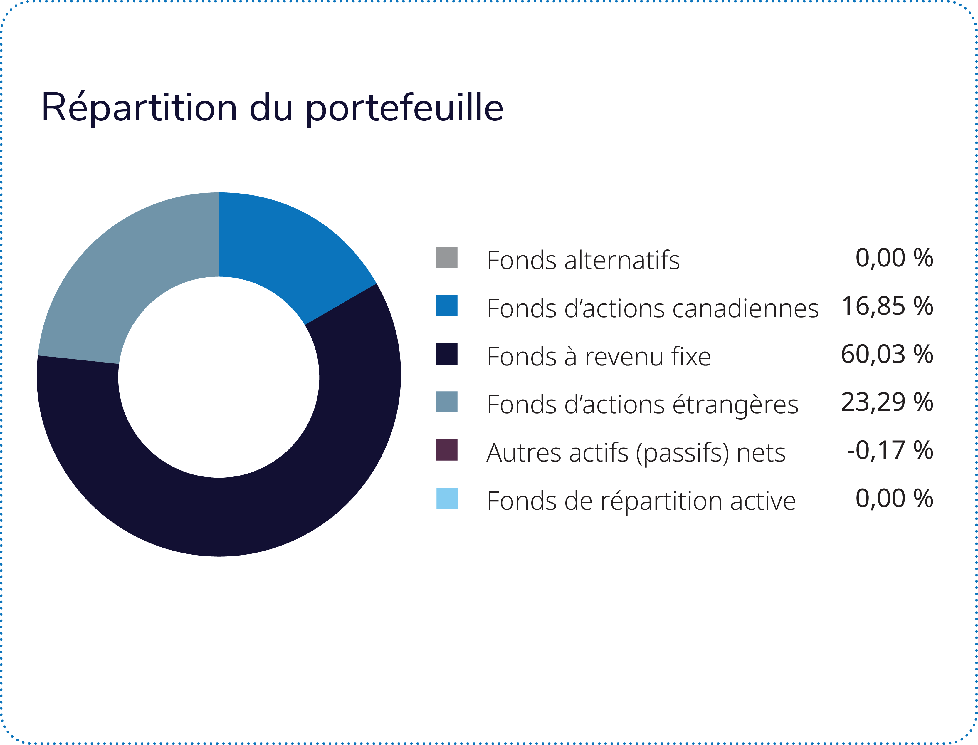 Les marchés des actions et du crédit ont bien fait au troisième trimestre, ce qui a favorisé le rendement du portefeuille. Les actions nord-américaines ont avancé, poussées par les secteurs de la technologie de l’information et des matériaux, alors que les perspectives d’assouplissement des banques centrales ont renforcé la confiance des investisseurs. Les marchés obligataires, en particulier aux États-Unis, ont produit d’excellents rendements, alors que les écarts de crédit sont demeurés étroits en raison de la stabilité des fondamentaux des sociétés. La surpondération des actions a eu un effet positif sur le rendement, car les actions mondiales ont surpassé les titres à revenu fixe. Profitant de l’écart des taux d’intérêt entre les États-Unis et le Canada, la pondération des obligations canadiennes a continué d’être rehaussée graduellement, alors que la surpondération des titres à revenu fixe américains a été réduite. La position des titres à revenu fixe est par ailleurs demeurée neutre. Les titres à revenu fixe sont sous-pondérés, tandis que les placements en dollars américains sont surpondérés, ce qui a avantagé le rendement du portefeuille au troisième trimestre.