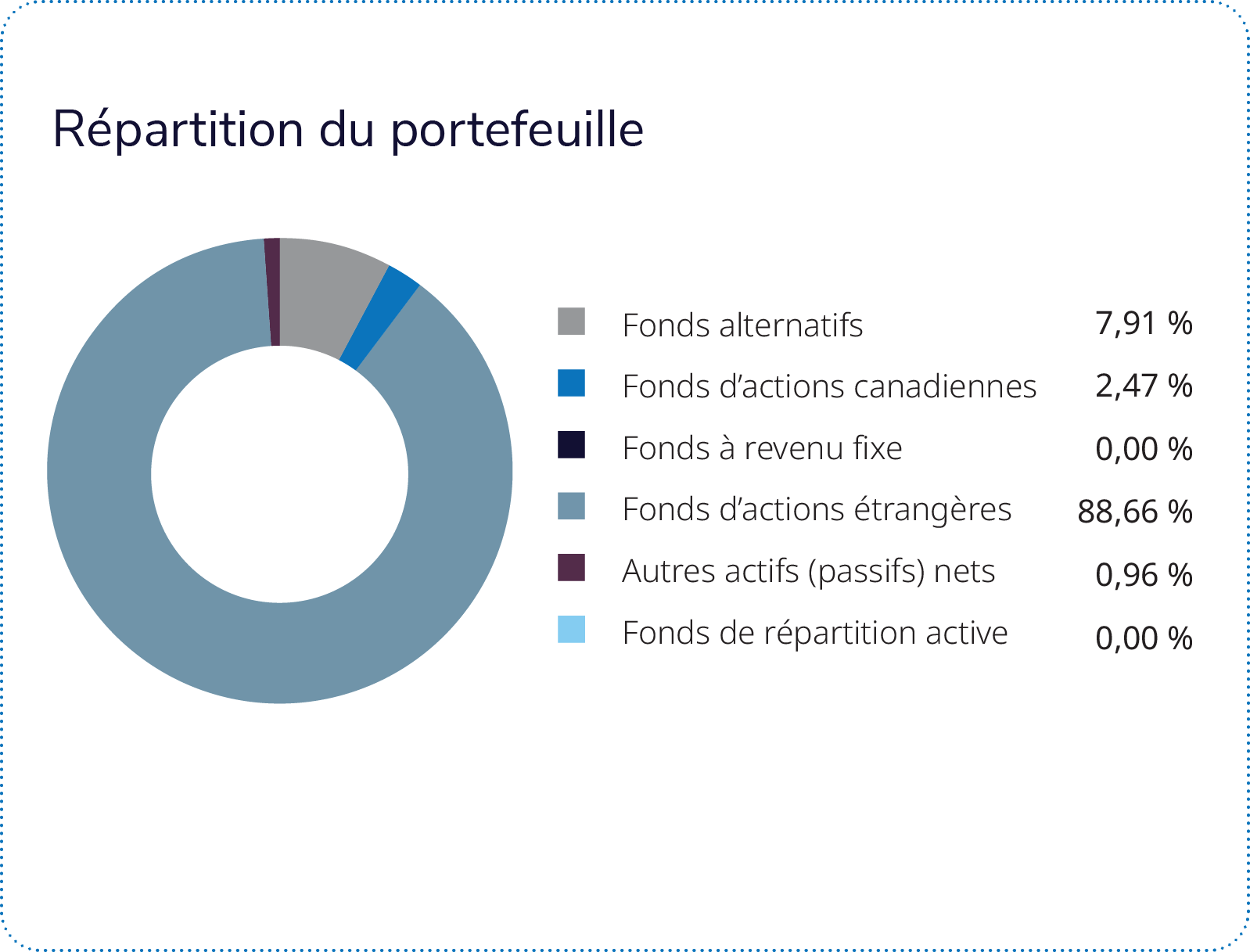 Le Fonds en gestion commune d’actions américaines Mackenzie – IG, le Fonds de croissance É.-U. Putnam – IG Mandat privé et le Fonds de perception de primes de risque diversifiées Mackenzie ont nui le plus au rendement. Le Fonds en gestion commune d’actions américaines Mackenzie – IG a terminé le trimestre en baisse, mais a surpassé son indice de référence. Sur une base relative, la sélection des titres dans le secteur de la finance et la sous-pondération du secteur de la technologie de l’information ont contribué au rendement. La sélection des titres dans le secteur de la santé a nui au rendement. Le Fonds de croissance É.-U. Putnam – IG Mandat privé a généré un rendement négatif, mais a surpassé son indice de référence ce trimestre. La sélection des titres dans le secteur de la technologie de l’information a contribué le plus au rendement. La sous-pondération du secteur de la consommation de base a nui le plus au rendement. Le Fonds de perception de primes de risque diversifiées Mackenzie, une stratégie alternative combinant une exposition aux actions et de multiples stratégies alternatives de manière efficace sur le plan du capital, a nui au rendement en raison du recul des actions américaines.