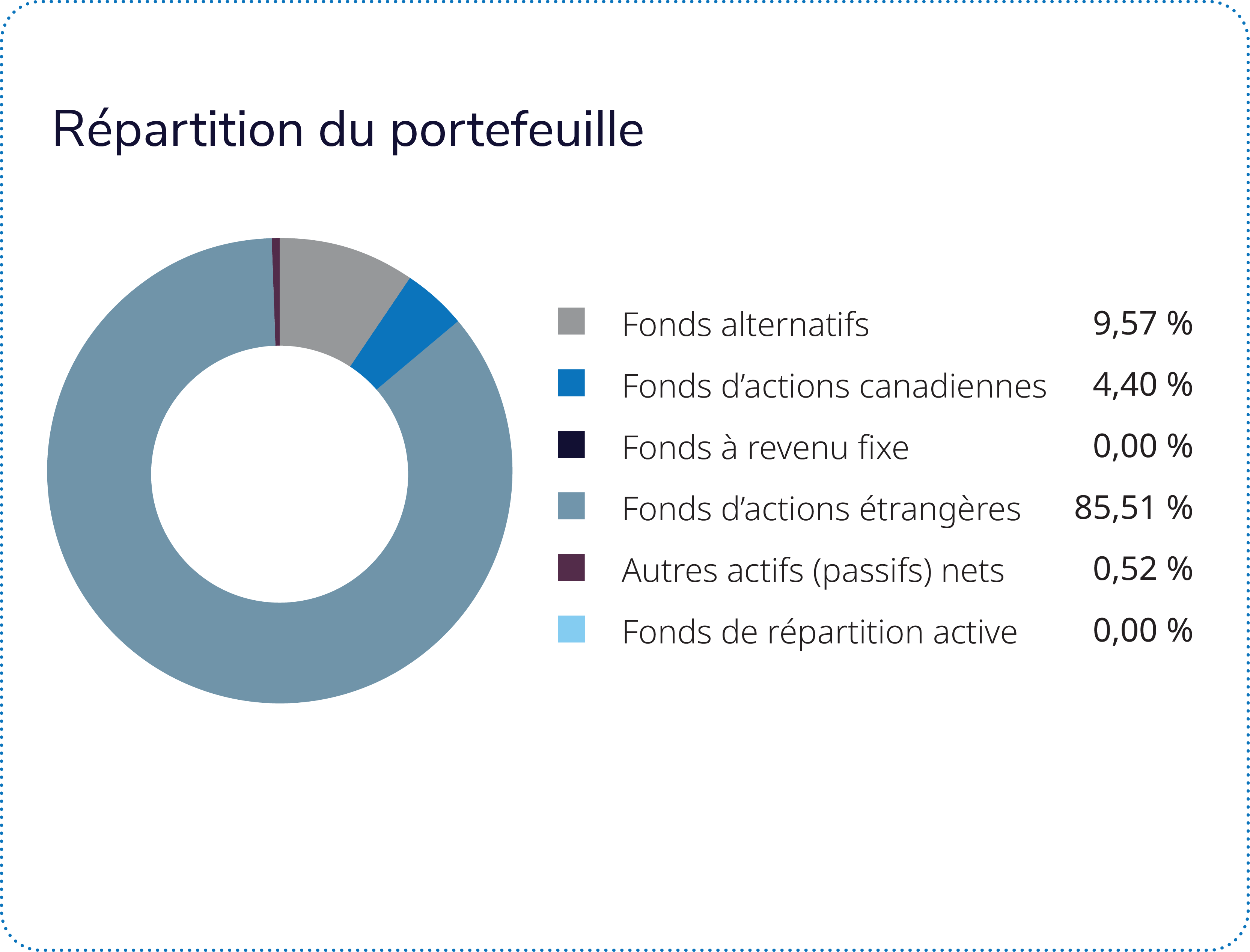 Aucun facteur n’a freiné le rendement durant le trimestre. Le Fonds de primes de risque améliorées sur titres à revenu fixe Mackenzie et le Fonds en gestion commune de marchés émergents JPMorgan – IG II sont ceux qui ont le moins favorisé le rendement du portefeuille. Le Fonds de primes de risque améliorées sur titres à revenu fixe Mackenzie est un fonds alternatif à revenu fixe ayant recours à l’effet de levier. L’équipe de placement utilise le Fonds pour gérer de façon efficace l’exposition globale du portefeuille aux titres à revenu fixe. La baisse des taux a entraîné une hausse des prix des obligations et favorisé les rendements des titres à revenu fixe. Le Fonds en gestion commune de marchés émergents JPMorgan – IG II a profité du solide rendement des actions des marchés émergents au cours de la période.