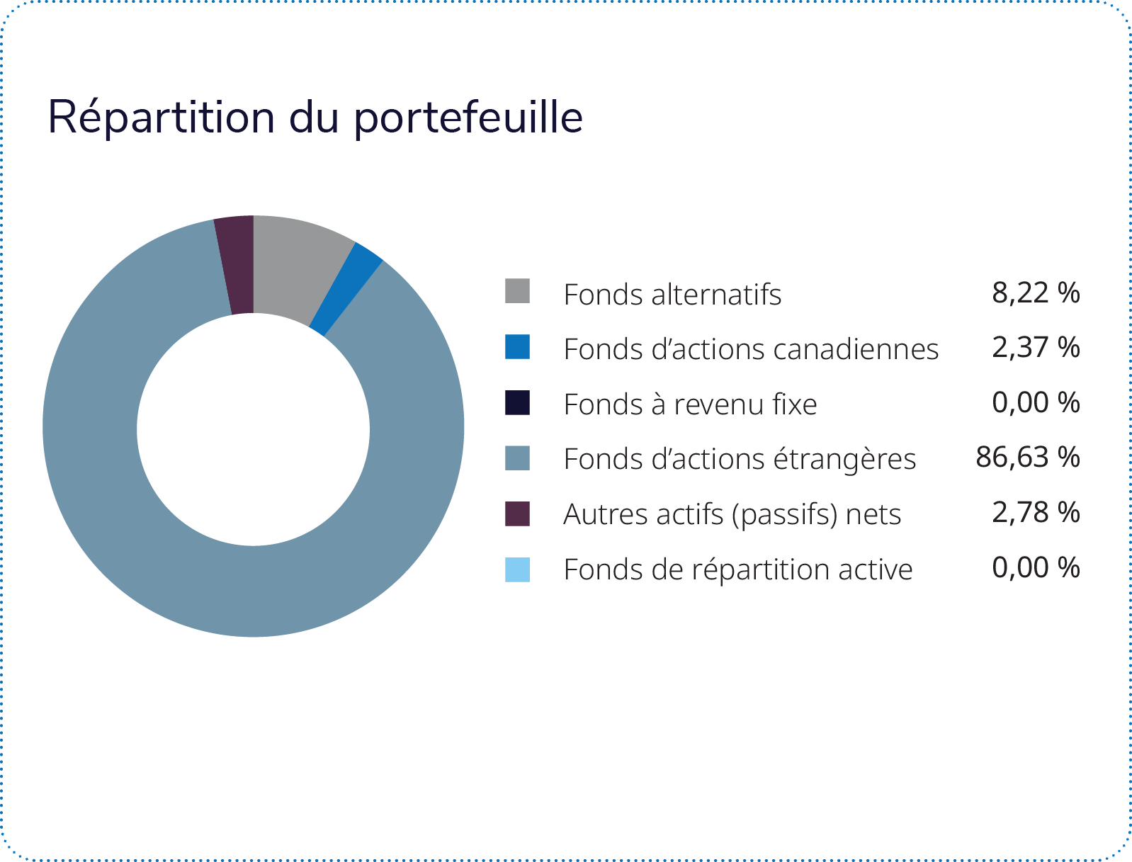 Le Fonds de croissance É.-U. Putnam – IG Mandat privé est le seul à avoir nui au rendement, tandis que le Fonds de primes de risque améliorées sur titres à revenu fixe Mackenzie a été l’un des plus faibles contributeurs. Le Fonds de croissance É.-U. Putnam – IG Mandat privé a affiché des rendements légèrement négatifs, plombé par les actions de la technologie de l’information; or, cet effet a été partiellement compensé par la vigueur du secteur de la santé. Sur une base relative, le Fonds a surpassé son indice de référence, soutenu par la sélection de titres dans les secteurs de la santé, de l’industrie et de la finance, tandis que les services de communication ont nui au rendement. Le Fonds de primes de risque améliorées sur titres à revenu fixe Mackenzie, une stratégie pour placements à revenu fixe alternative ayant recours à l’effet de levier, a permis de gérer efficacement l’exposition du portefeuille. La baisse des taux obligataires mondiaux a propulsé le prix des obligations, favorisant les rendements des titres à revenu fixe.