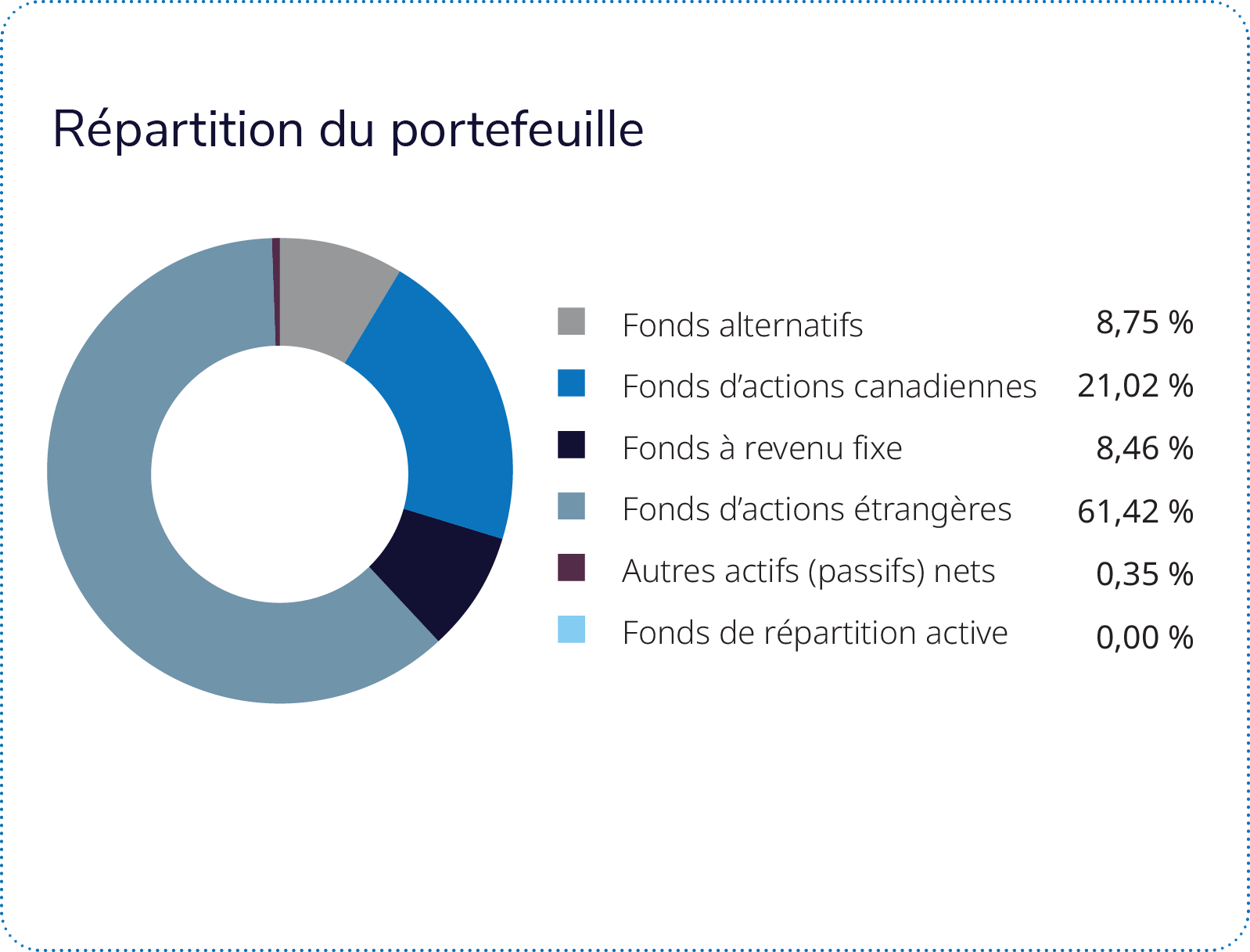 Le Fonds en gestion commune d’actions américaines Mackenzie – IG, le Fonds de croissance É.-U. Putnam – IG Mandat privé et le Fonds de perception de primes de risque diversifiées Mackenzie ont nui le plus au rendement. Le Fonds en gestion commune d’actions américaines Mackenzie – IG a terminé le trimestre en baisse, mais a surpassé son indice de référence. Sur une base relative, la sélection des titres dans le secteur de la finance et la sous-pondération du secteur de la technologie de l’information ont contribué au rendement. La sélection des titres dans le secteur de la santé a nui au rendement. Le Fonds de croissance É.-U. Putnam – IG Mandat privé a généré un rendement négatif, mais a surpassé son indice de référence ce trimestre. La sélection des titres dans le secteur de la technologie de l’information a contribué le plus au rendement. La sous-pondération du secteur de la consommation de base a nui le plus au rendement. Le Fonds de perception de primes de risque diversifiées Mackenzie, une stratégie alternative combinant une exposition aux actions et de multiples stratégies alternatives de manière efficace sur le plan du capital, a nui au rendement en raison du recul des actions américaines.