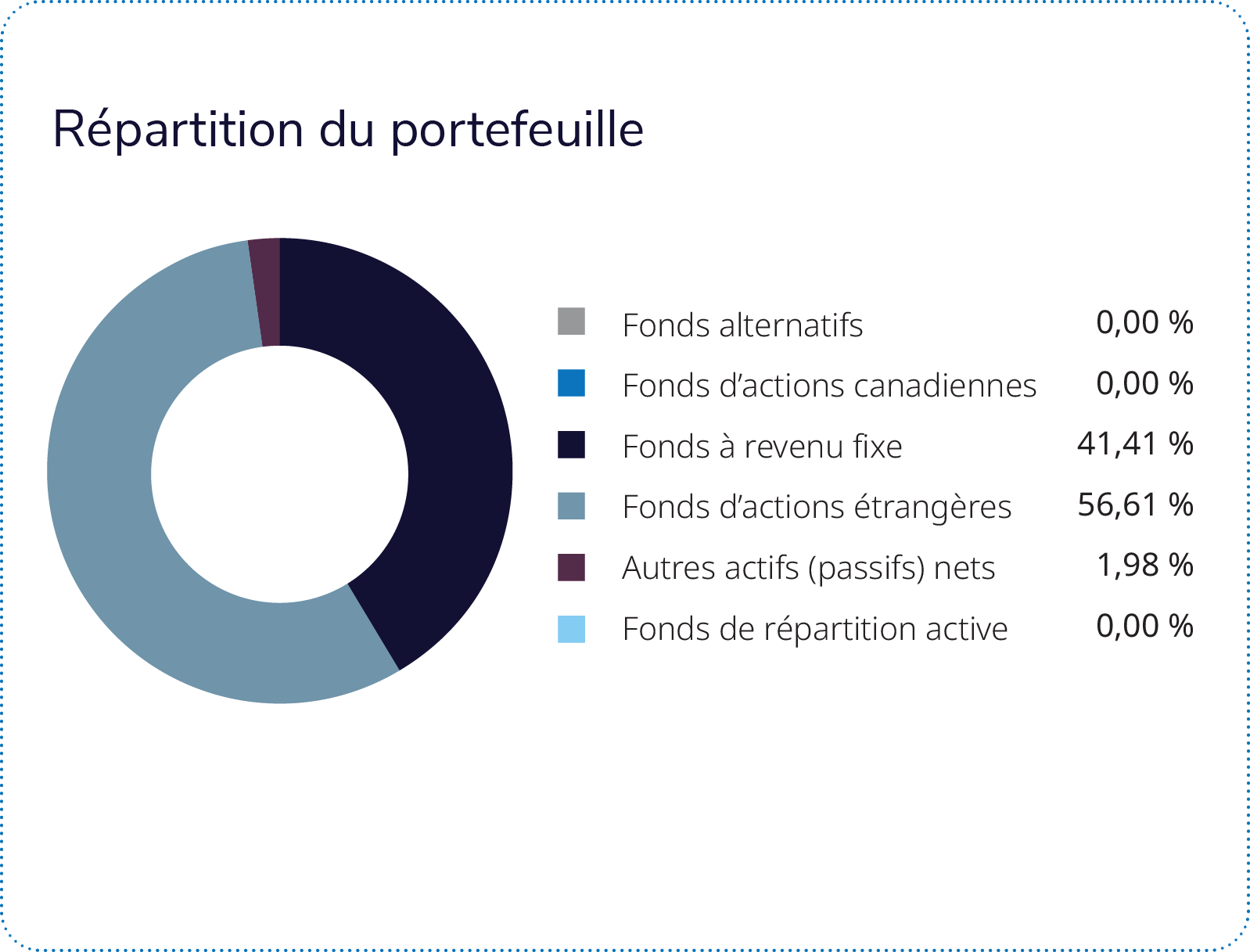 Le Fonds canadien d’obligations Mackenzie, qui représente 14 % du portefeuille, a nui au rendement. Une surpondération des obligations gouvernementales à plus courte duration et de titres de certaines sociétés non financières a contribué au rendement. Une sous-pondération des obligations fédérales et provinciales à plus longue duration a contribué à la sous-performance relative.