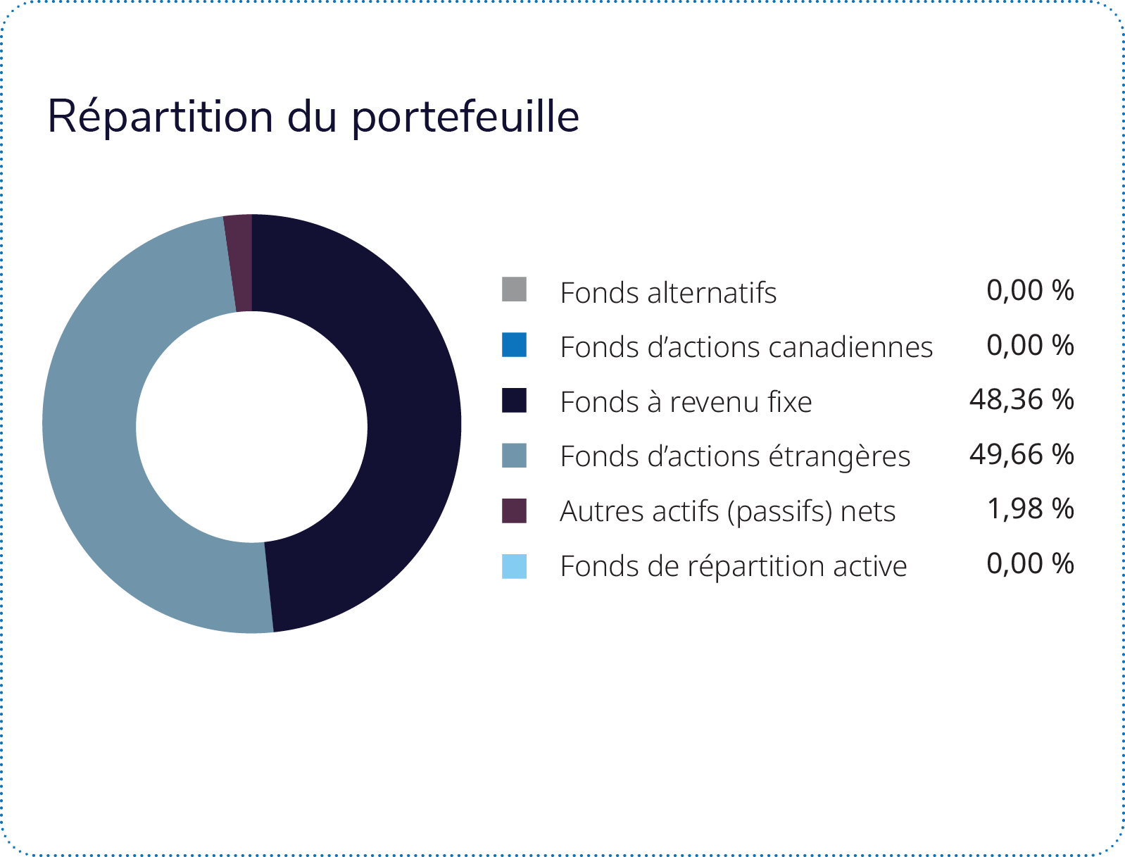 Le Fonds canadien d’obligations Mackenzie, qui représente 16 % du portefeuille, a nui au rendement. Une surpondération des obligations gouvernementales à plus courte duration et de titres de certaines sociétés non financières a contribué au rendement. Une sous-pondération des obligations fédérales et provinciales à plus longue duration a contribué à la sous-performance relative.