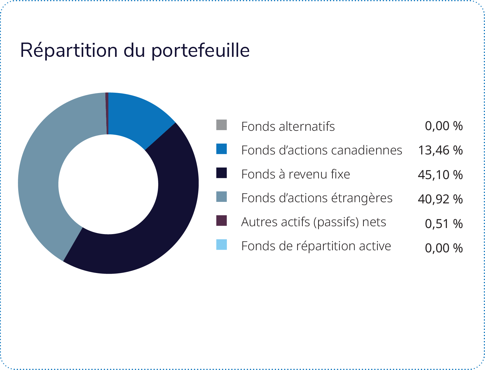 La répartition de l’actif a été positive durant le trimestre. La légère surpondération des actions japonaises et la sous-pondération des actions américaines ont eu un effet positif sur le rendement actif, tandis que la position acheteur sur le yen japonais a également contribué de façon significative au rendement. Sur le plan de la valeur relative, les positions géographiques ont été positives au cours du trimestre grâce à la surpondération de la Corée, de Taïwan et du Royaume-Uni. La surpondération de la Chine et du Japon, ainsi que la sous-pondération de l’Australie, ont le plus nui au rendement. La rotation sectorielle des actions américaines a eu un effet légèrement négatif. Bien que la sous-pondération de la consommation discrétionnaire et de la consommation de base ait contribué au rendement, la surpondération de la technologie de l’information et de la finance l’a entravé.