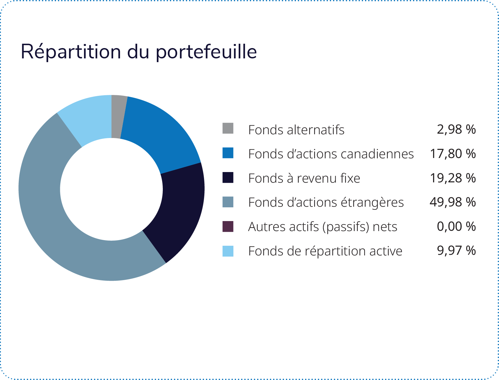 Le Fonds privé de titres à revenu fixe Profil (0,5 %) est le Fonds Profil le plus fortement représenté dans le portefeuille; cependant, en raison de sa légère progression, il n’a contribué que modestement au rendement total du portefeuille. Les obligations mondiales ont terminé l’année en territoire largement positif. Aux États-Unis, la Réserve fédérale a abaissé ses taux pour la troisième fois de suite, portant le taux des fonds fédéraux dans une fourchette de 3,50 % à 3,75 %, ce qui a soutenu les obligations américaines, tout particulièrement sur le segment à court terme de la courbe. En Europe, la plupart des banques centrales ont suspendu leur cycle d’assouplissement, alors que les obligations gouvernementales britanniques ont reculé à la suite de l’annonce du budget par le gouvernement et que les obligations des pays de l’Europe périphérique, comme l’Italie, ont bénéficié d’une amélioration de la note de crédit. Les obligations canadiennes sont restées stables, la Banque du Canada ayant maintenu ses taux, même si les prévisions laissent entrevoir un assouplissement prolongé. Au Canada et aux États-Unis, les obligations de sociétés ont surpassé les obligations gouvernementales, les obligations à rendement élevé prenant la tête, tandis que les écarts de taux se sont resserrés. La composante des obligations mondiales (gérée par la Corporation PIMCO Canada) a été la plus performante. Le Fonds de biens immobiliers IG Mackenzie et la composante d’obligations canadiennes du Fonds ont été les deux composantes les plus décevantes du Fonds et ont nui au rendement. La composante d’obligations canadiennes a freiné le rendement, principalement à cause de la sélection des obligations de sociétés.